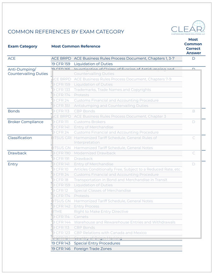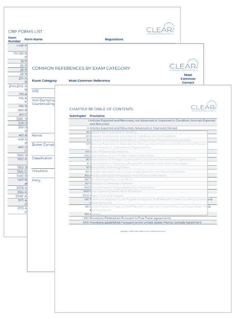 Electronic copies of our Quick Reference Sheets: CBP Forms List, Common References by Exam Category, and Chapters 98-99 and Appendices Tables of Contents