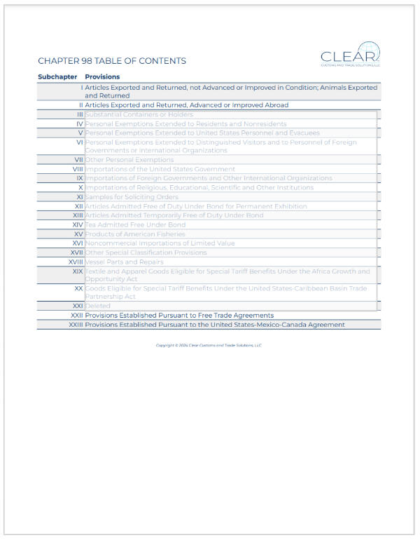 Tables of contents for 34 Subchapters of Chapters 98, 99 and 9 HTS Appendices | Great resource to efficiently navigate these parts